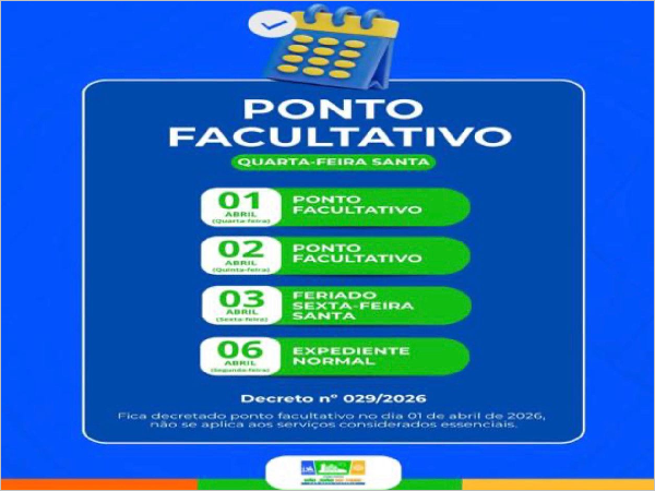 A Prefeitura Municipal informa que foi decretado ponto facultativo nos dias, 01 de abril (Quarta-feira Santa) e 02 de abril (Quinta-feira Santa), conforme o Decreto Nº 029/2026.